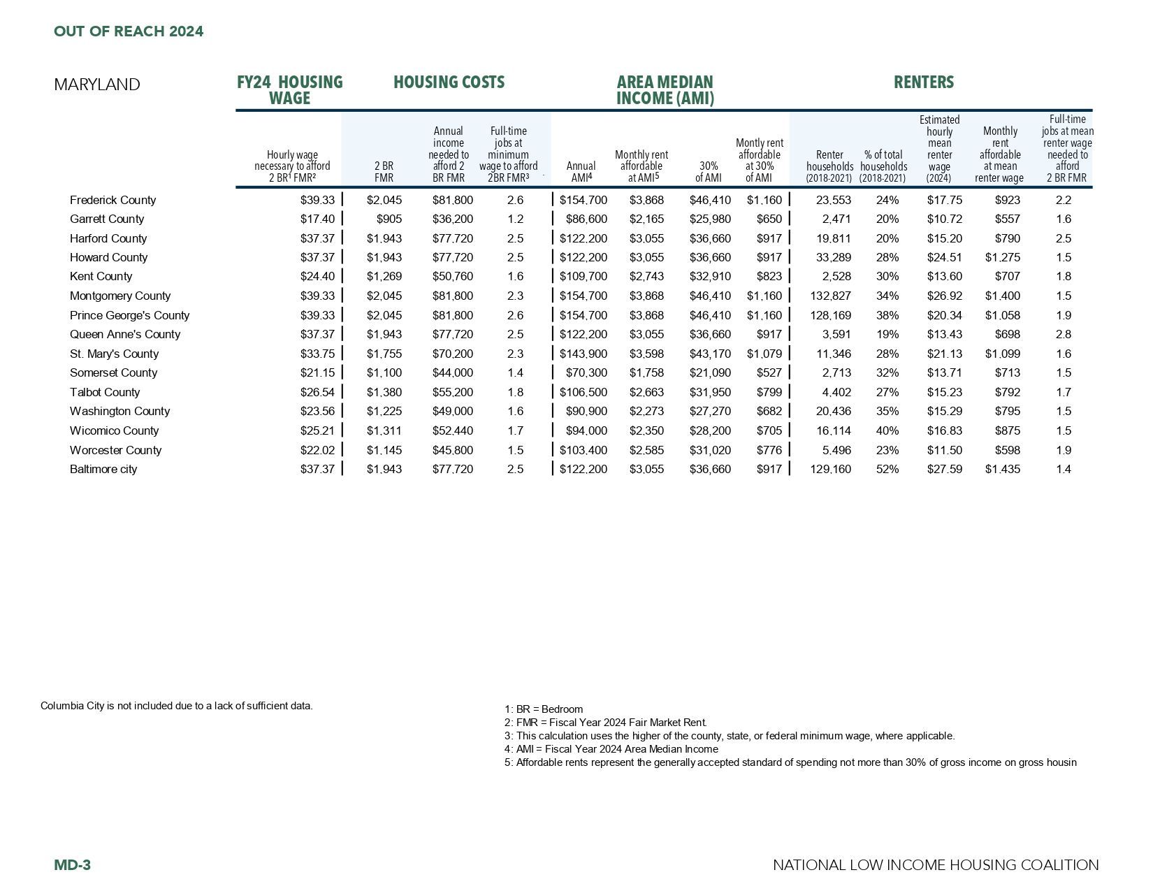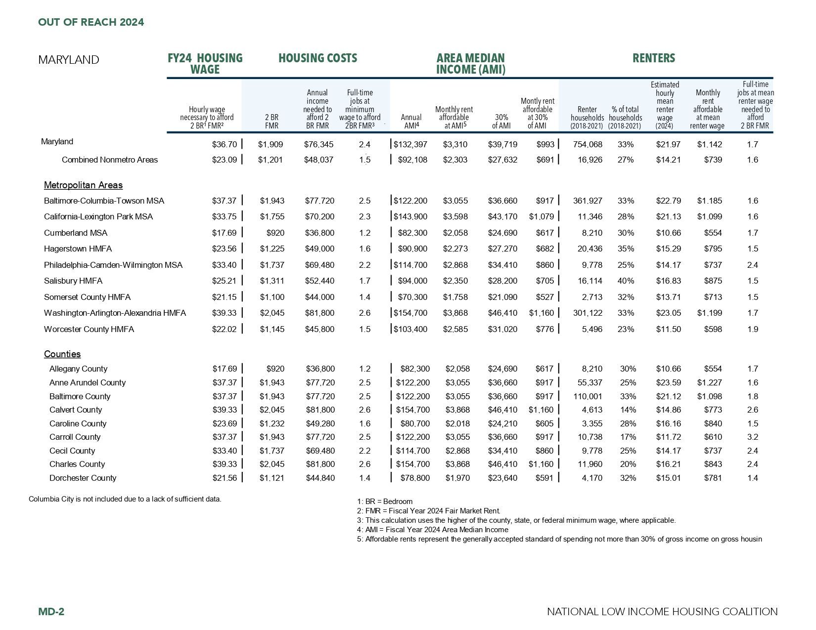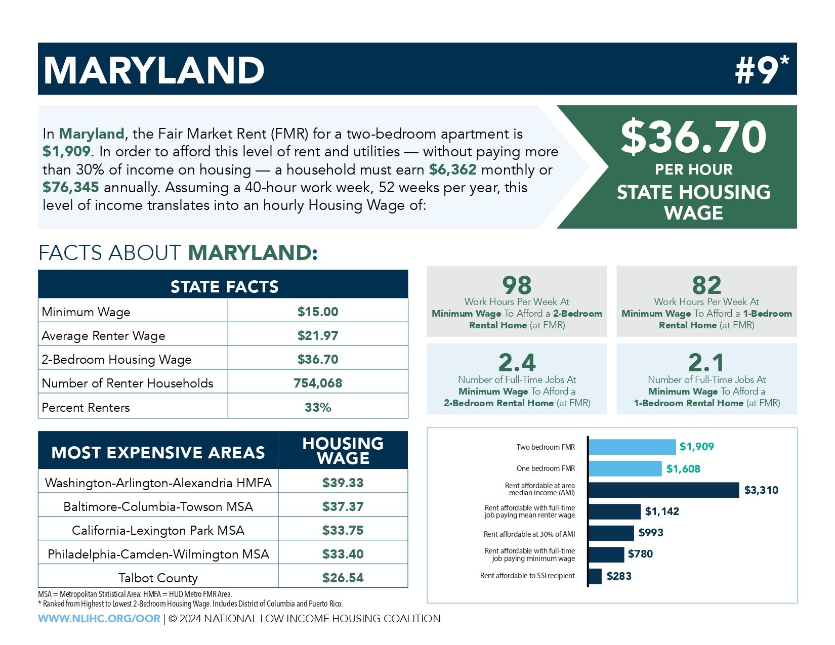 In 2024 Maryland families need to earn $36.70 per hour to afford a two bedroom apartment. If they earn minimum wage, they must work 98 hours per week to afford that same two bedroom. In Frederick County Maryland, families must earn between $28.46-$48.08 per hour to affording housing in their zip code.